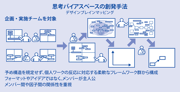 DBMは、マインドマップのような発散的個人発想法、プロジェクトマネージメント手法やビジネスモデル手法のような構造化フォーマットベースの管理手法、KJ法やブレインストーミングのようなランダム性依存ベースの発想法ではなく、多様な知見を活用可能な思考バイアスベースの創発手法です。