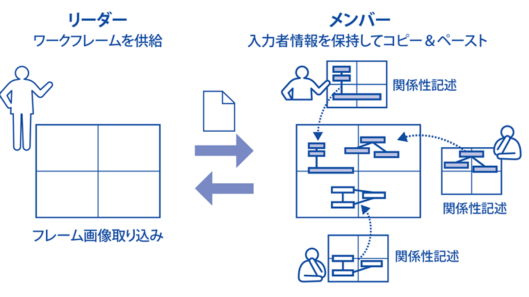 目的:メンバーが自ら問いを発見し、メンバー同士で創発し、リーダが合意形成までもっていくプロセスをストレス無く、効率化します。参加メンバー数が増加しても極度に効率が落ちない工夫がされています。