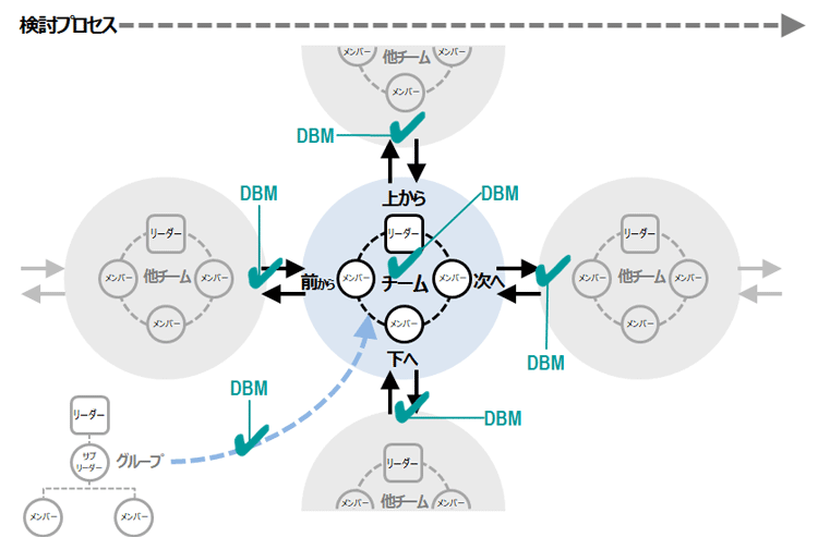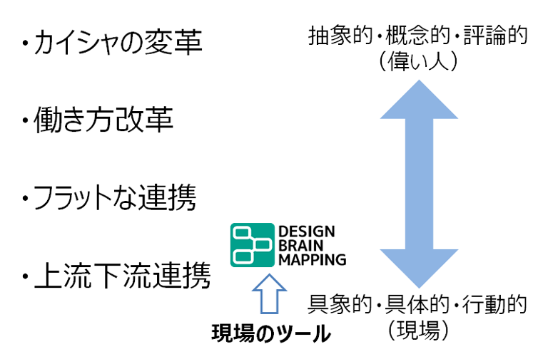 最近、時短勤務やモティベーションアップ等の視点の働き方改革、自己成長の場としてのカイシャの改革、組織のあり方としてフラットな組織や連携、企画部署と実施部署の連携等の上流下流連携等が問題意識として上がってきます。DBMは具象的・具体的・行動的な議論を誘発するための現場の手法と道具です。