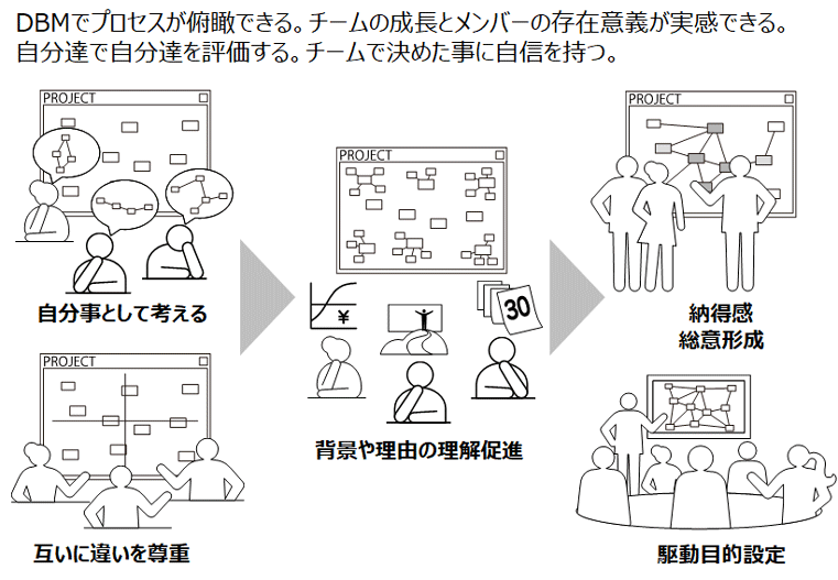 DBMではプロセスが記録できるので、それを見ていけば、チームの議論の進展、変化、進化も自分達で客観的に感じられ、その感想や主観をまた交換すれば、また対話や知恵が深まります。 進めていくとチームでどこかでストンと納得するのでそこまで行う事で達成感も得る事が可能です。