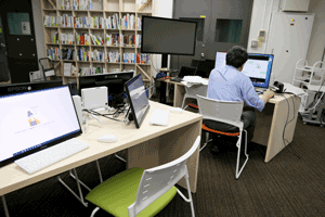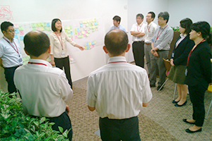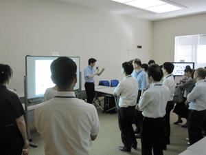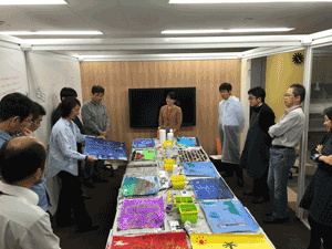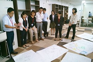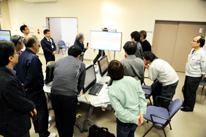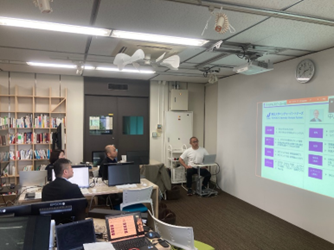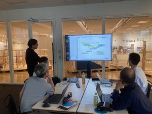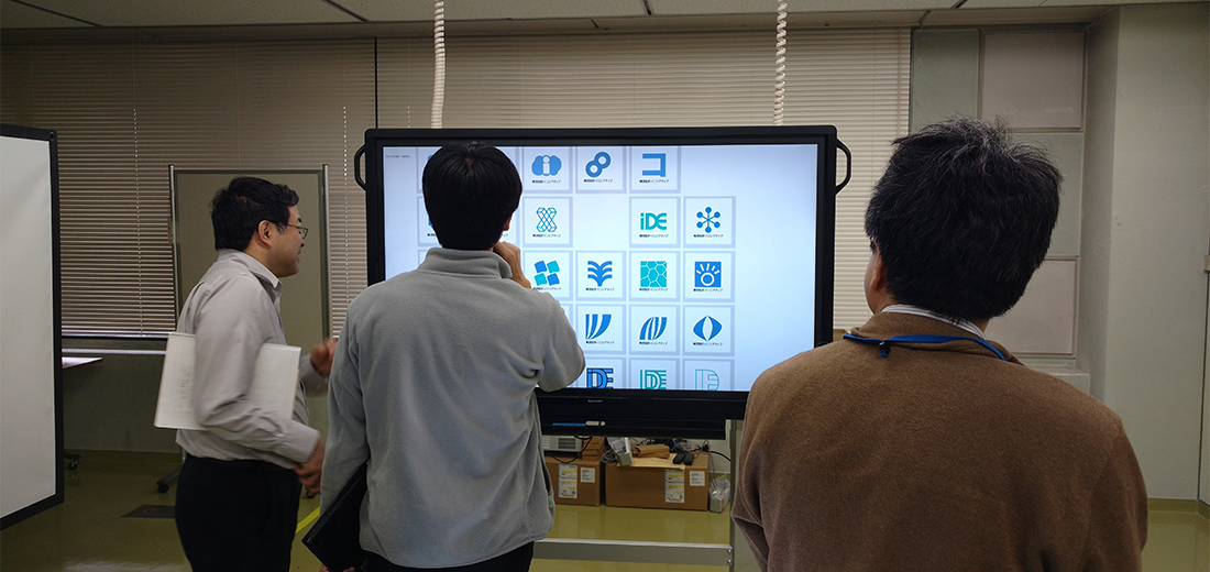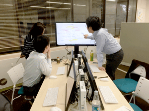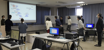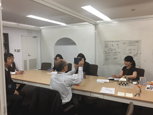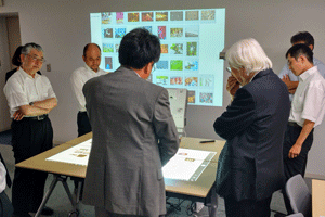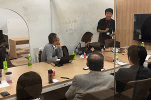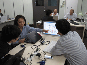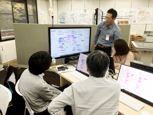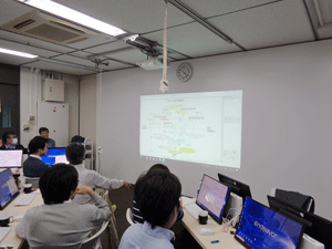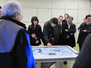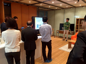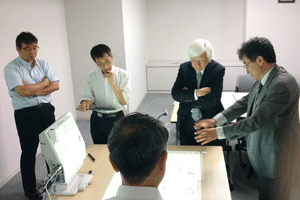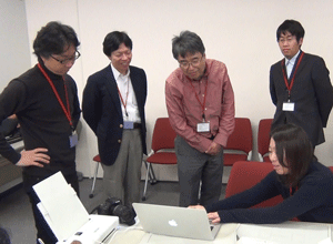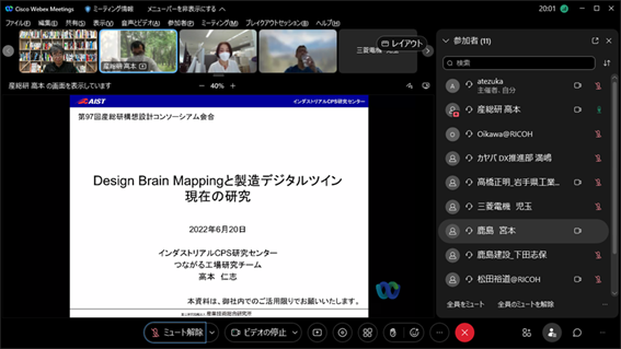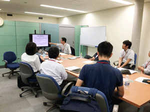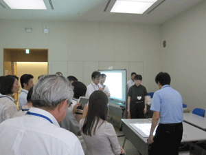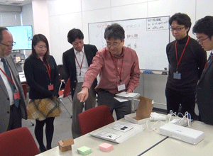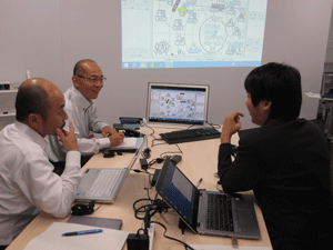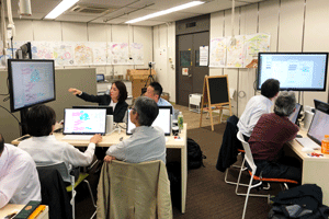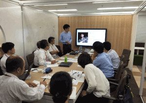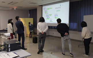 現在、異業種複数企業の方々のご意見等を取り入れながら、産総研で開発を進めております、ブレインストーミングを促進するツール、DBM(Design Brain Mapping)の進行状況の説明等を致しました後、筑波大学にて、ブレインストーミングを促進する環境構築の現在の進行状況のご見学を行っていただきました。