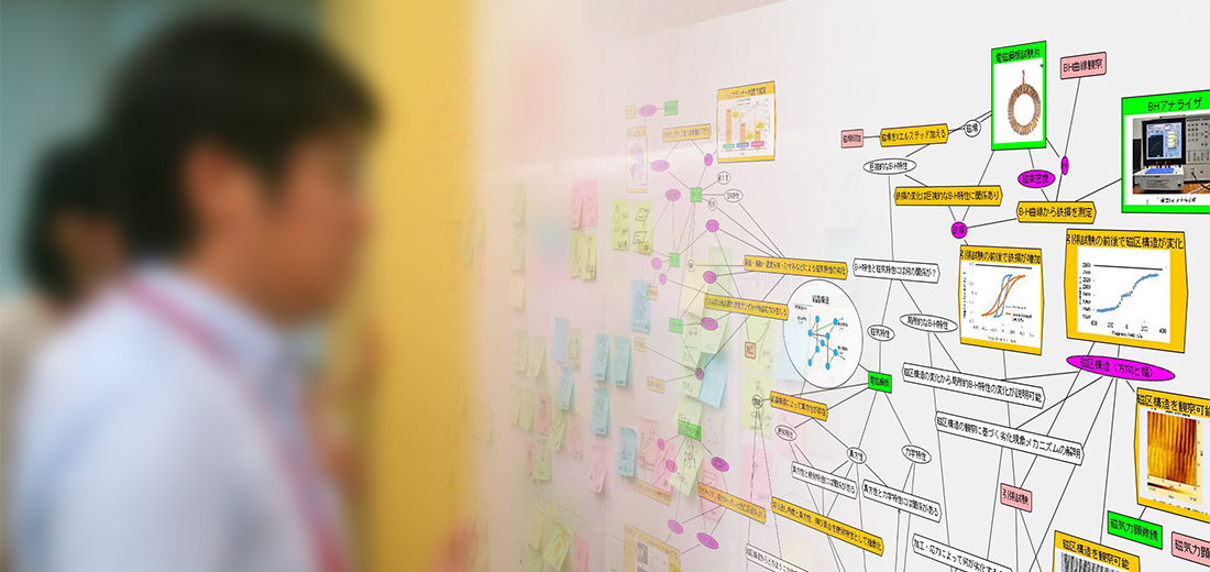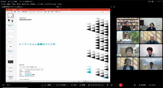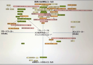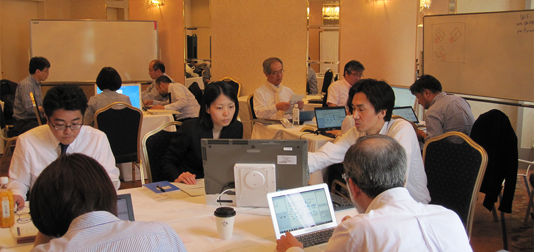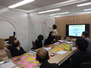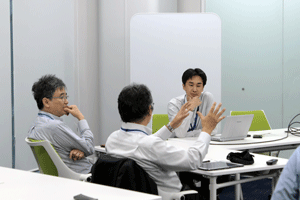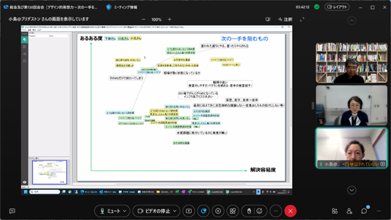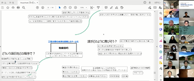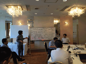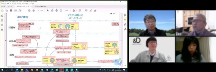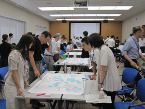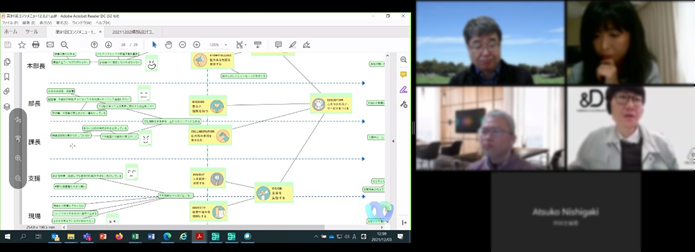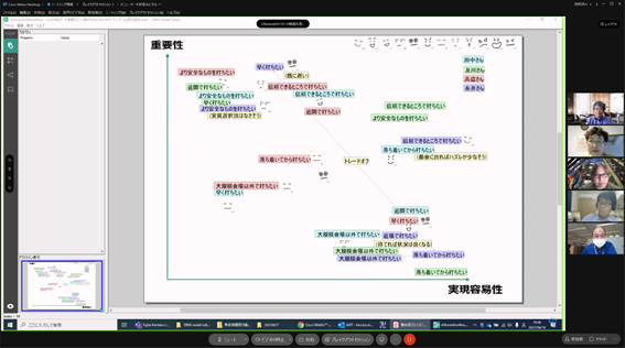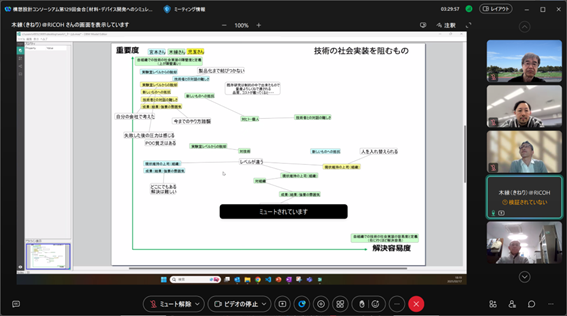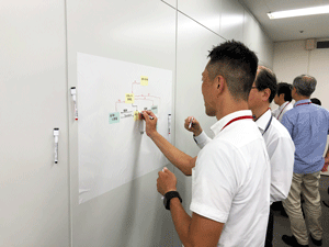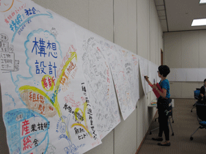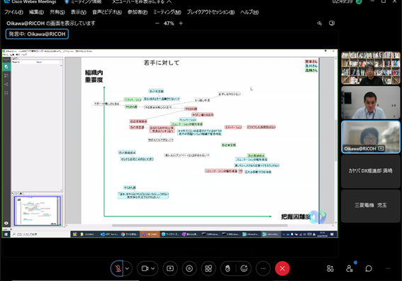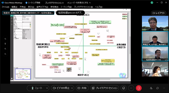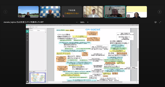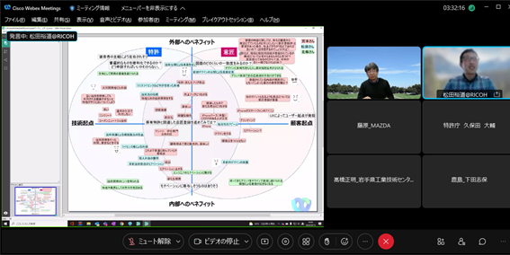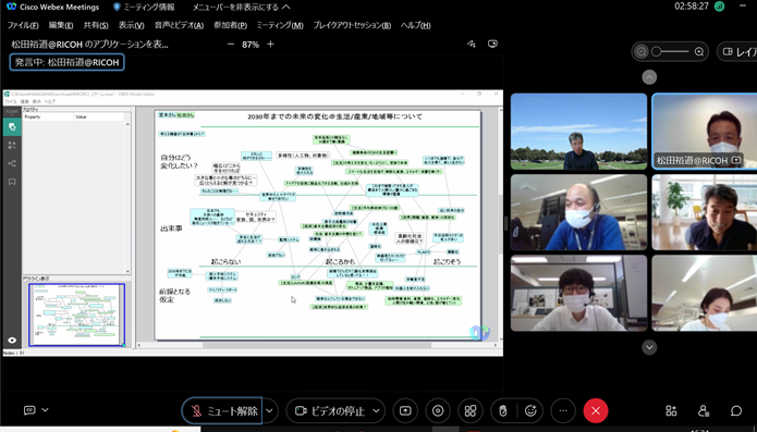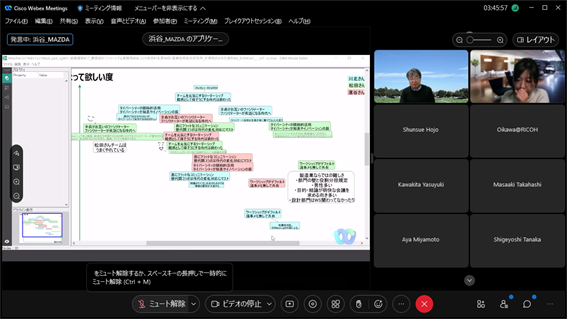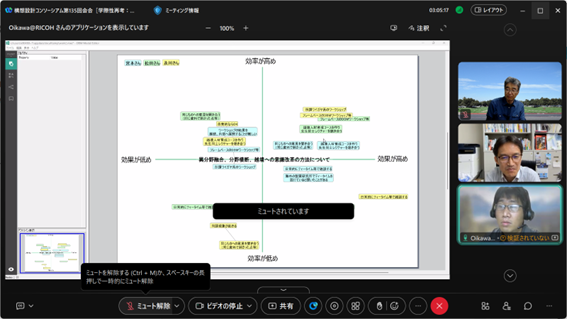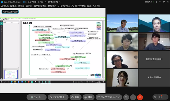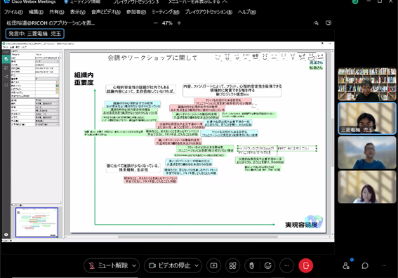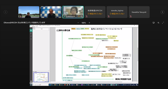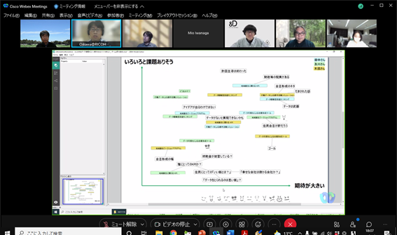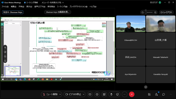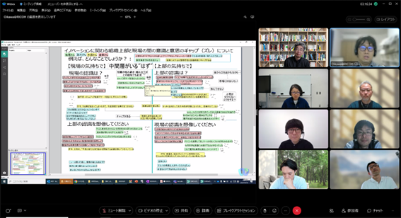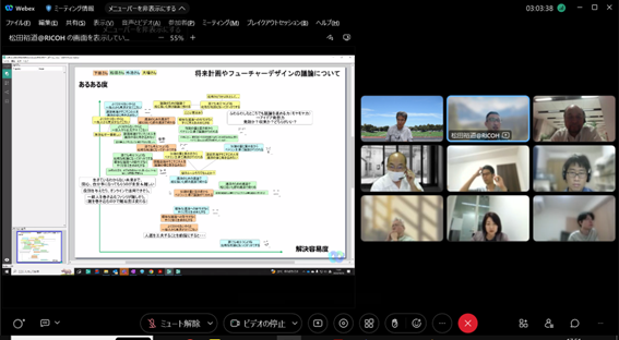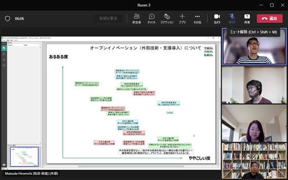 組織のフューチャーセッションに関わる現状の課題、向かうべき方向、そのために今行うべき事等、の事前設計に関わる議論組み立てを試みました。同時に、ファシリテーションスキルの属人性の問題、トップダウンではなくミドルアップの議論方法の問題等、人依存の現状を誰もが能力を発揮出来る形で、どのように研究開発に反映させ、打開していくかについての有効な知見も得られました。