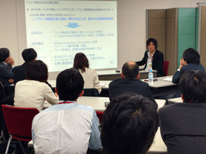 前半は[直営アパレル店舗の運営]というタイトルで、本社直営の店舗の店長として、陳列や店舗設計において、デザインや商品開発との関係をどのようにしているか、顧客観察や声かけでどのような事に気を遣っているか等、店舗目線での話題提供をいただきました。