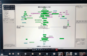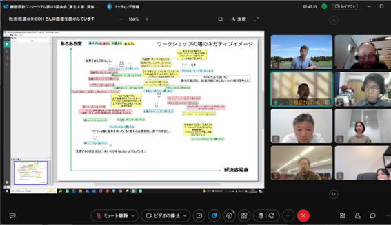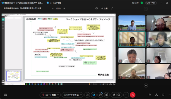 後半は、鈴木氏にも参加頂き、チーム議論と全体共有からなるリモートワークショップを行い、「ワークショップ参加へのネガティブイメージ」「ワークショップの場のネガティブイメージ」という2つのワークについて、メンバーの意識の違いから背景を交換し、様々な議論を行いました。