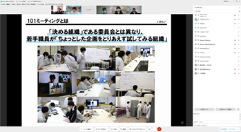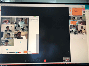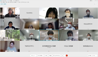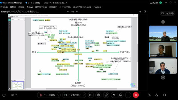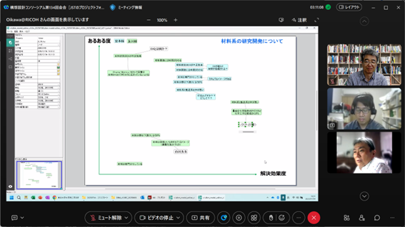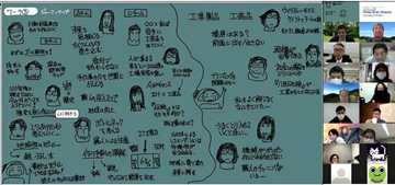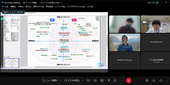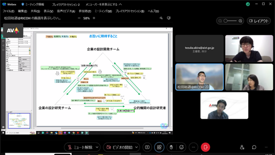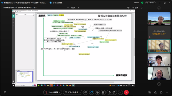 後半は、福井氏にも参加頂き、チーム議論と全体共有からなるリモートワークショップを行い、「自分と周囲の軸でのポジショニング」「材料系の研究開発について」というワークを起点に、メンバー同士で異なる前提や背景を交換し、様々な議論を行いました。