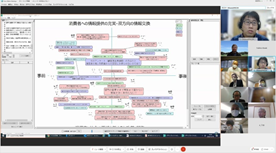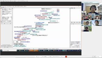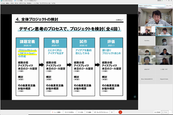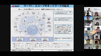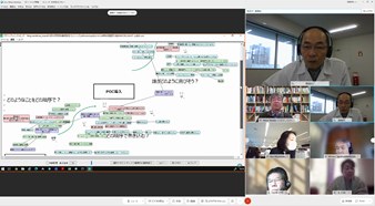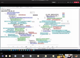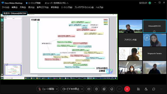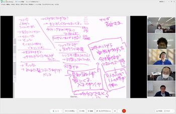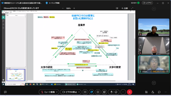 後半は、菅野氏にも参加頂き、チーム議論と全体共有からなるリモートワークショップを行い、「大学のよりよい環境構築にお互いに期待すること」「社会やビジネスの変革に対してお互いに期待すること」という2つのワークを起点に、メンバー同士で異なる前提や背景を交換し、様々な議論を行いました。