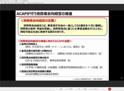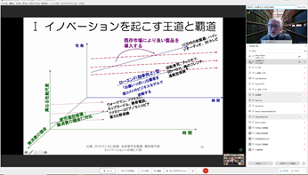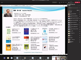 前半は[サステナビリティ活動と企業経営]というタイトルで、財務情報に主眼をおいた経営がされている日本の現状に対して、むしろ非財務情報であるサステナビリティ情報が重要であり、企業経営の観点からの昨今の動向、知的財産権等について、ご自身の企業経営の経験も踏まえて、話題提供をいただきました。