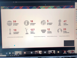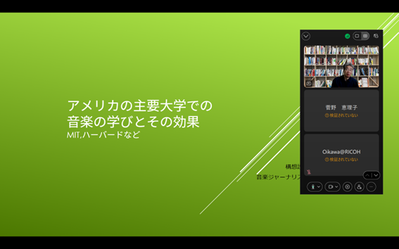 前半は[アメリカの主要大学での音楽の学びとその効果MIT,ハーバードなど]という内容で、未来の科学者やITエンジニアたちがリベラルアーツとしての音楽からどのような学びを得ているかを中心に、実際のクラスの様子やそこでの音楽も参照しながら、話題提供して頂きました。リベラルアーツがビジネスパーソンに資する理由、社会が抱える課題が複雑化する中で、教養を深める意義、人気科目としての音楽教育の意義等、詳しく丁寧に共有いただきました。