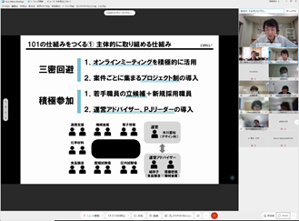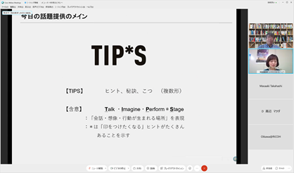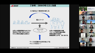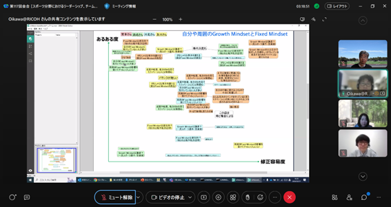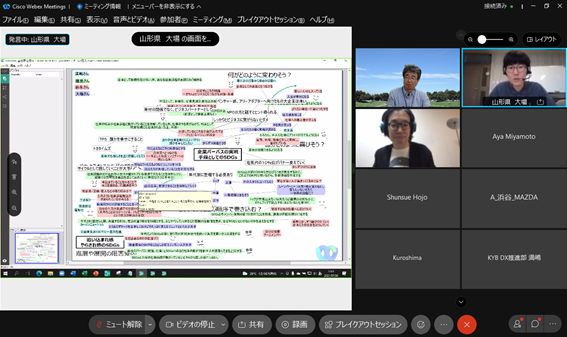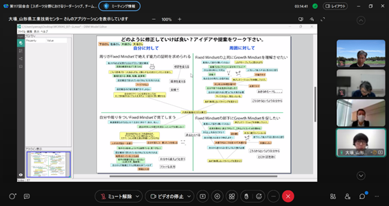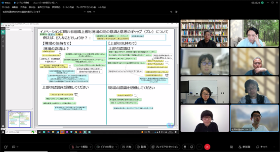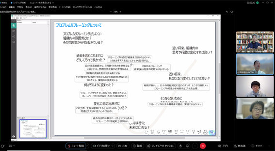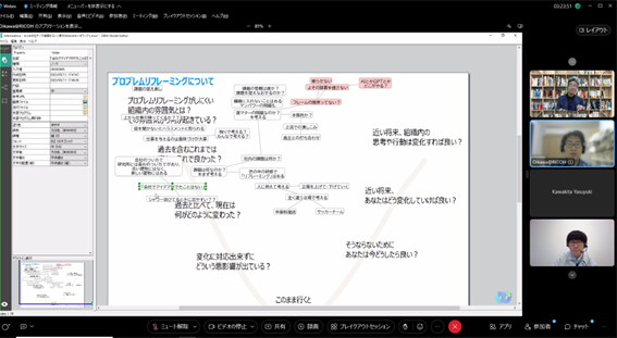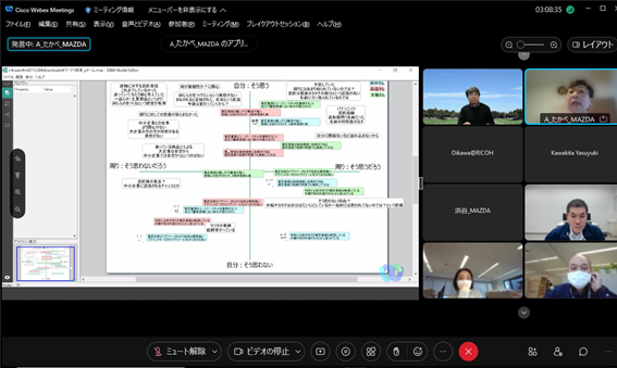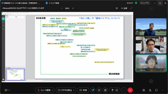 後半は、大場氏にも参加頂き、チーム議論と全体共有からなるリモートワークショップを行い、[次の一手を阻むものについての認知バイアスの違い][チームで次の一手”についてのネガポジ]というワークを起点に、メンバー同士で異なる前提や背景を交換し、活発な議論を行いました。