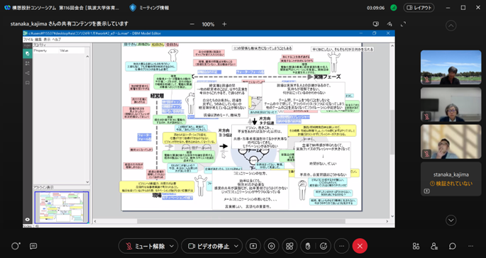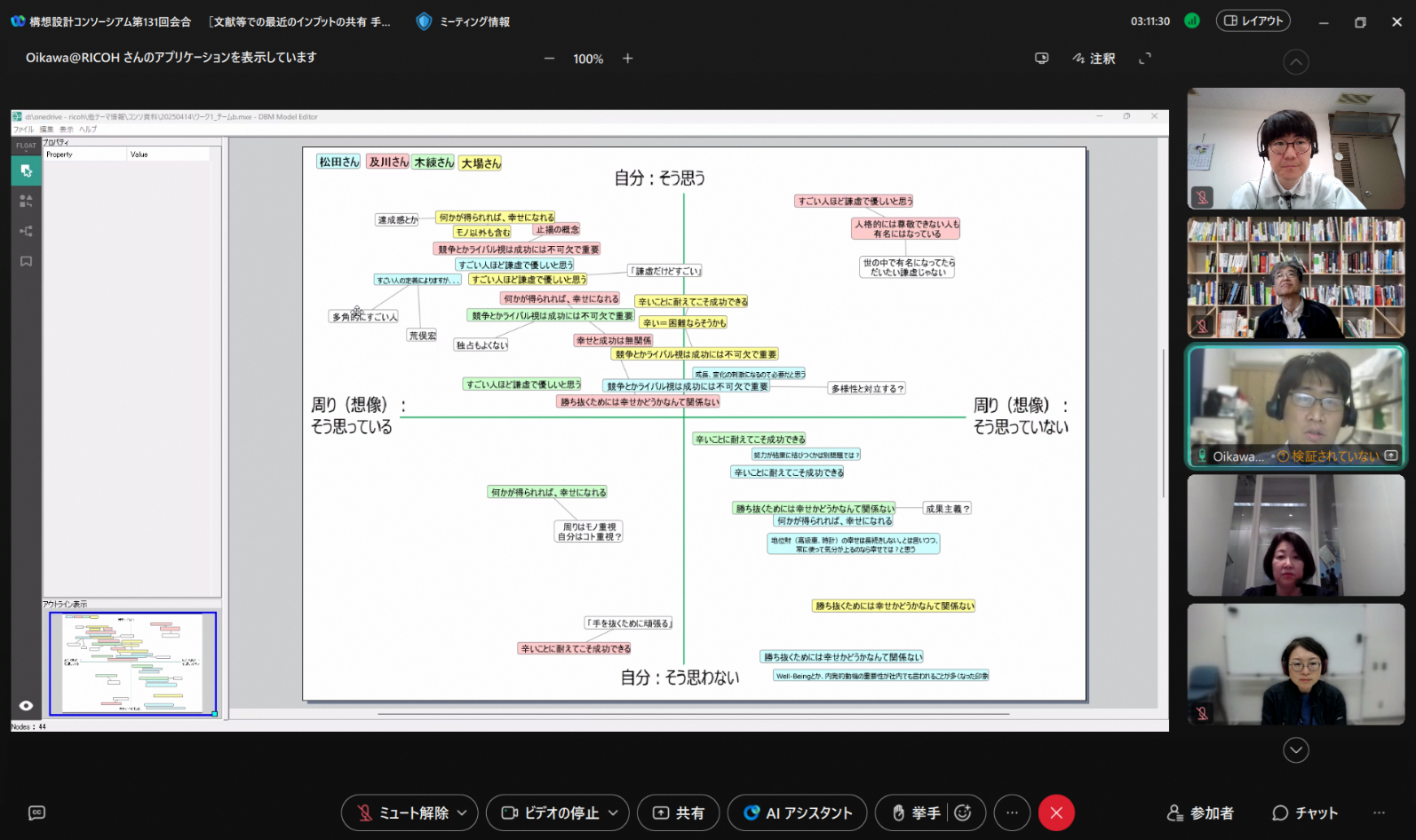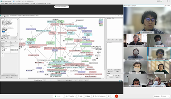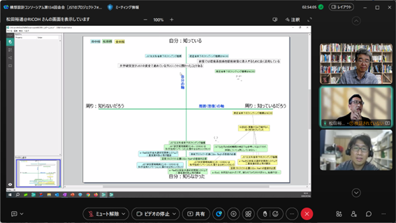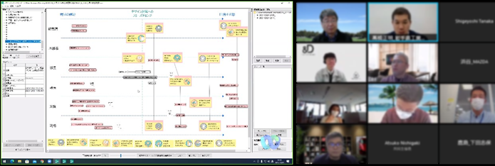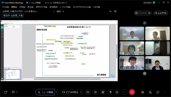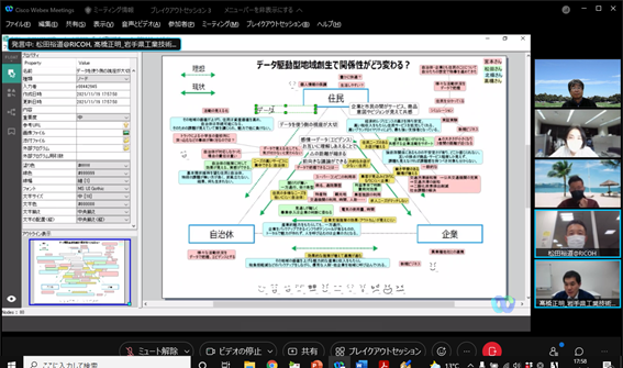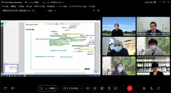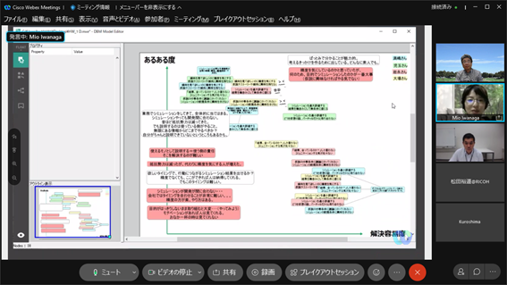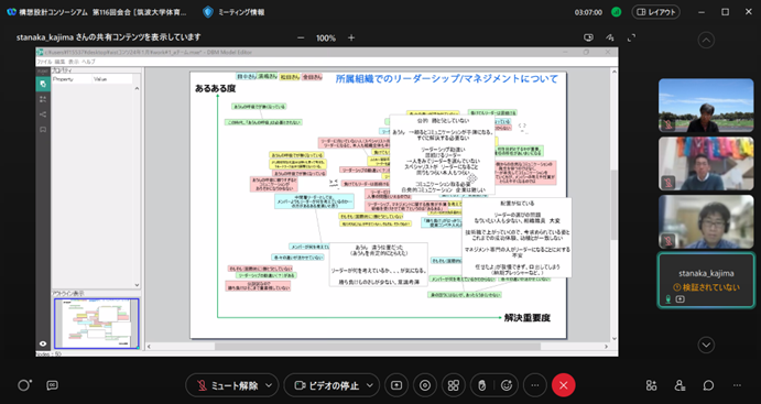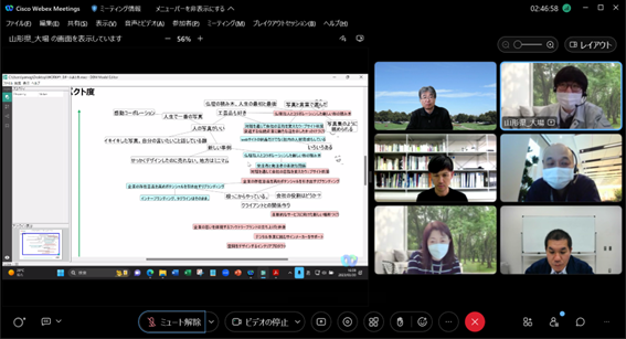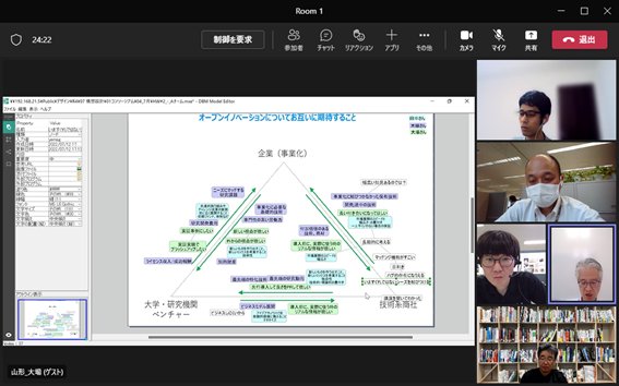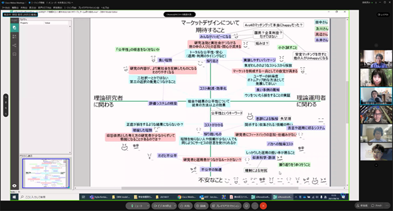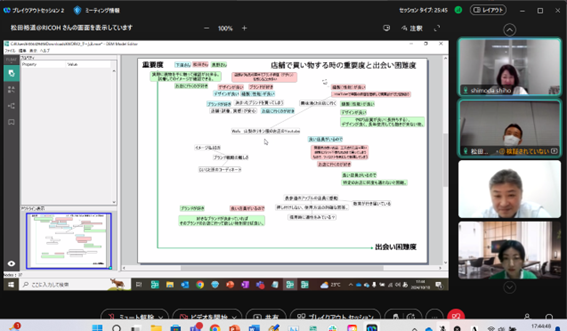 構想設計プロセスの把握と改善の為に、デザインブレインマッピング(DBM)というデジタルKJ法ソフトウェアを開発しています。その問題意識とユースケースを具体的に共有した後、研究開発に落とし込むという手法をとっており、それについて、先生と議論致しました。