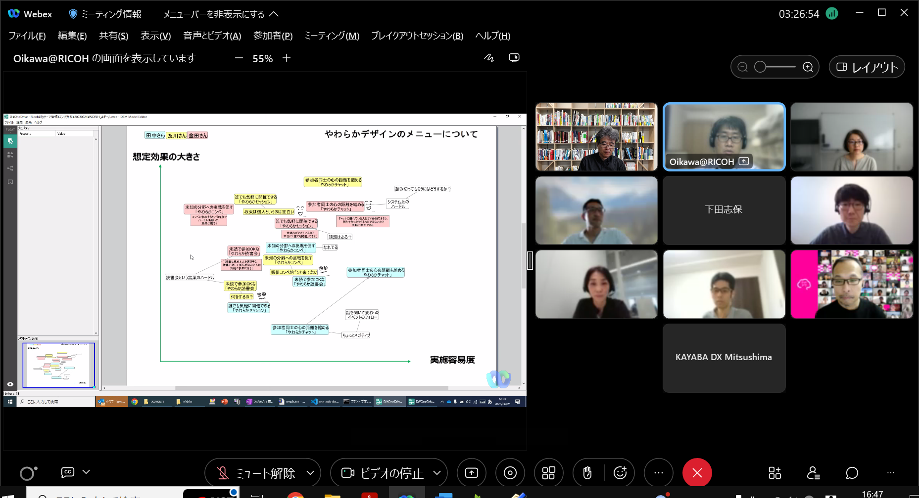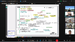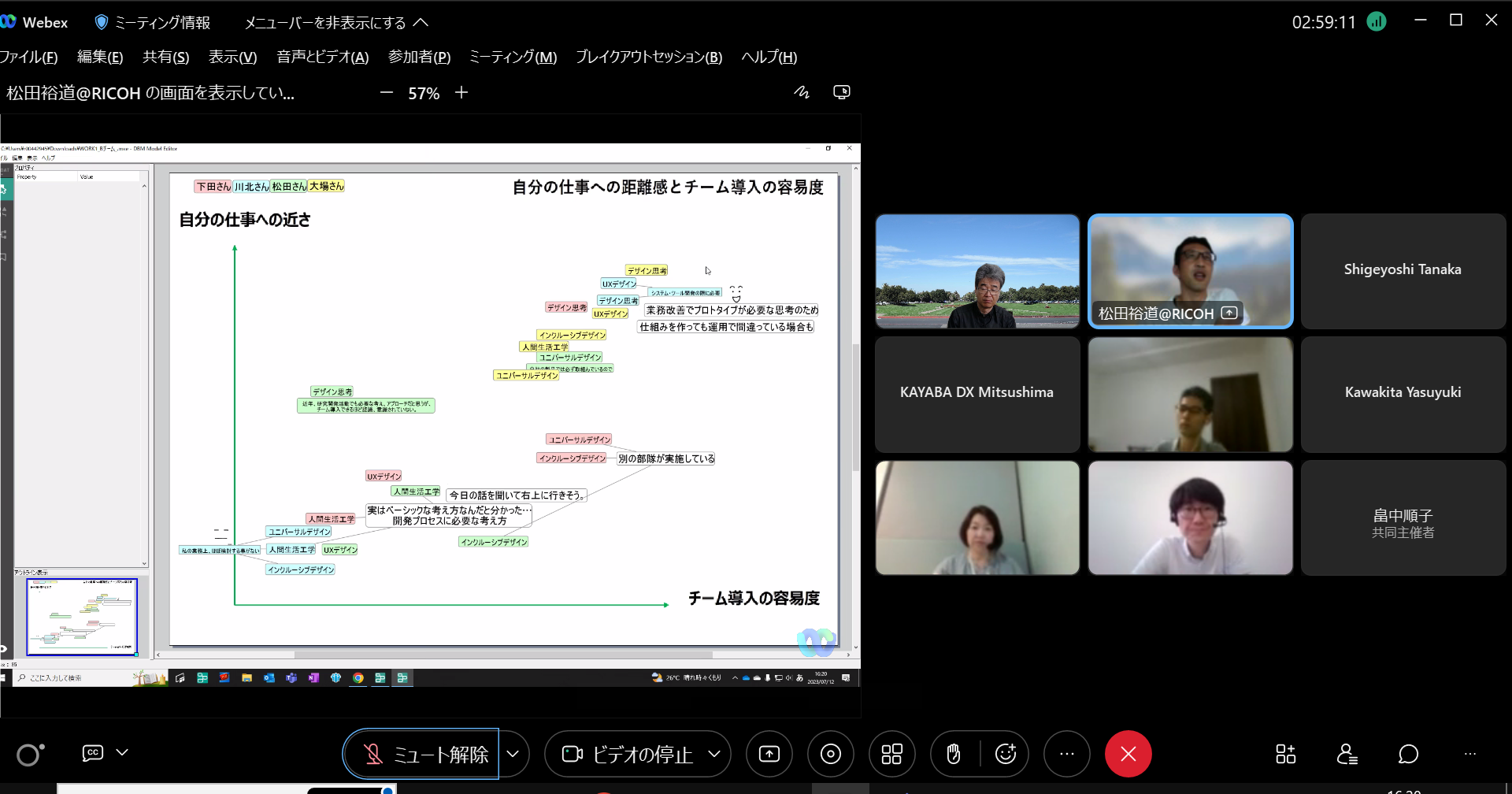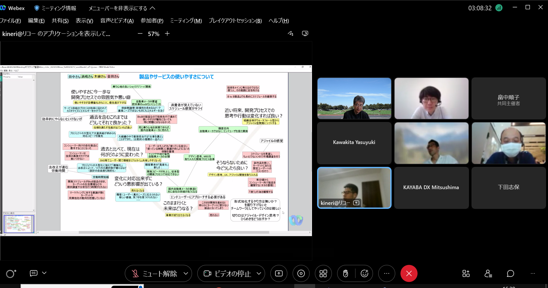 構想設計プロセスの把握と改善の為に、デザインブレインマッピング(DBM)というデジタルKJ法ソフトウェアを開発しています。その問題意識とユースケースを具体的に共有した後、研究開発に落とし込むという手法をとっており、それについて、先生と議論致しました。