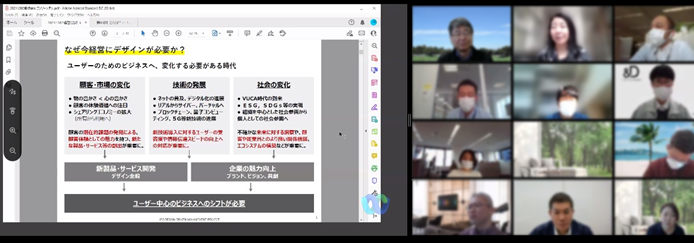 前半は[デザイン的発想力~次の一手を引き出すみんなのデザイン~]という内容で、デザインの説明、デザインシンキングとロジカルシンキングの違い、デザインシンキングを動かすパーパス、それらを進めるためのデザイン的発想力という流れで、それぞれの関係性や位置づけも含めて、話題提供して頂きました。