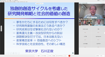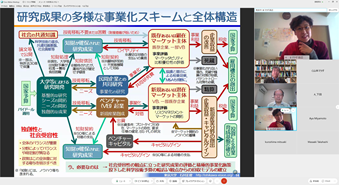 企業での開発及び事業化の体験知見の共有、「体験学習」のご紹介、JST研究開発戦略センターの「研究開発の俯瞰報告書」等のご紹介、更にはJSTフェローとしてノーベル賞の解説についてのお話等、盛りだくさんの具体的な内容で盛り上がりました。