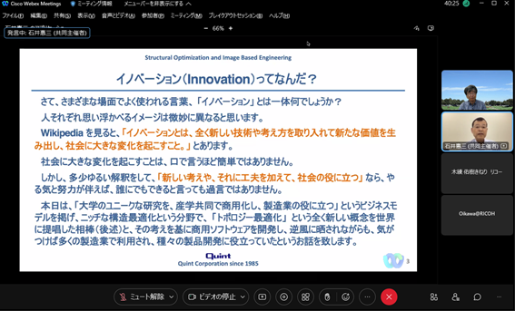前半は[感性設計学と脳の情報理論-第一原理から構築する感性の数理基盤-]と題して、その研究の経緯や背景も含めて、課題と活動、その可能性について、広く話題提供をいただきました。