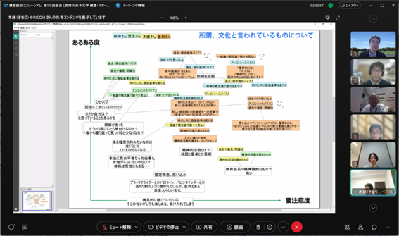後半は、桑島氏にも参加頂き、チーム議論と全体共有からなるリモートワークショップを行い、[「当たり前」や「認知バイアス」について][異分野融合・分野横断・越境への意識改革について]というワークを起点に、メンバー同士で異なる前提や背景を交換し、活発な議論を行いました。