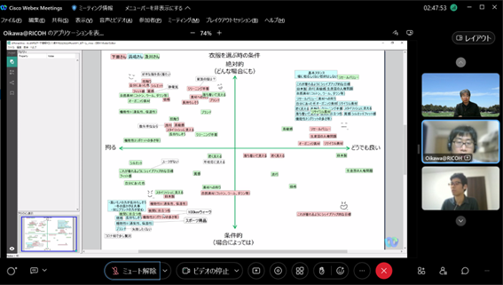 後半は、佐藤氏にも参加頂き、チーム議論と全体共有からなるリモートワークショップを行い、「相互に期待すること」「店舗での買い物の認知バイアスの違い」という2つのワークについて、メンバーの意識の違いを起点に、メンバー同士で異なる前提や背景を交換し、様々な議論を行いました。