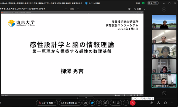2025年1月の会合のゲストは、感性分野において、感性のメカニズムの理解とその第一原理となる数理基盤の構築の研究を行っている東京大学大学院工学系研究科機械工学専攻 柳澤秀吉准教授でした。感性分野に関わる初めての回として企画しました。