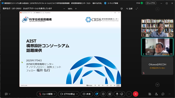 2025年7月の会合のゲストは、旭化成(株)にて材料系の研究開発に携わり、現在は科学技術振興機構 研究開発戦略センター フェローをされている福井 弘行氏です。ご本人の経験も交えながら、JSTのプロジェクトフォーメーションについて、広くご紹介いただきます。