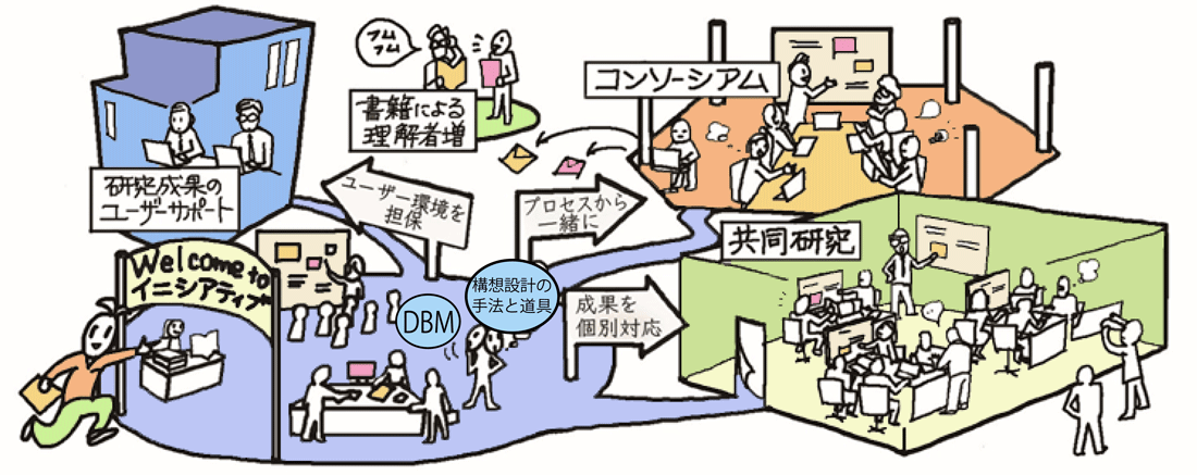 DBM、ブレストシステム、デザインと機能設計の効果測定モデル等の内容紹介や展示を行いました。