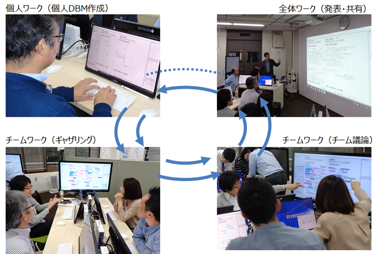 企業などで課題を抱える当事者チームが、問題解決の方法を自ら考え、彼らが腹落ちする問いと答えに到達出来るように、DBMワークショップを用いた問題解決デザインに関わる支援を産総研が行っています。